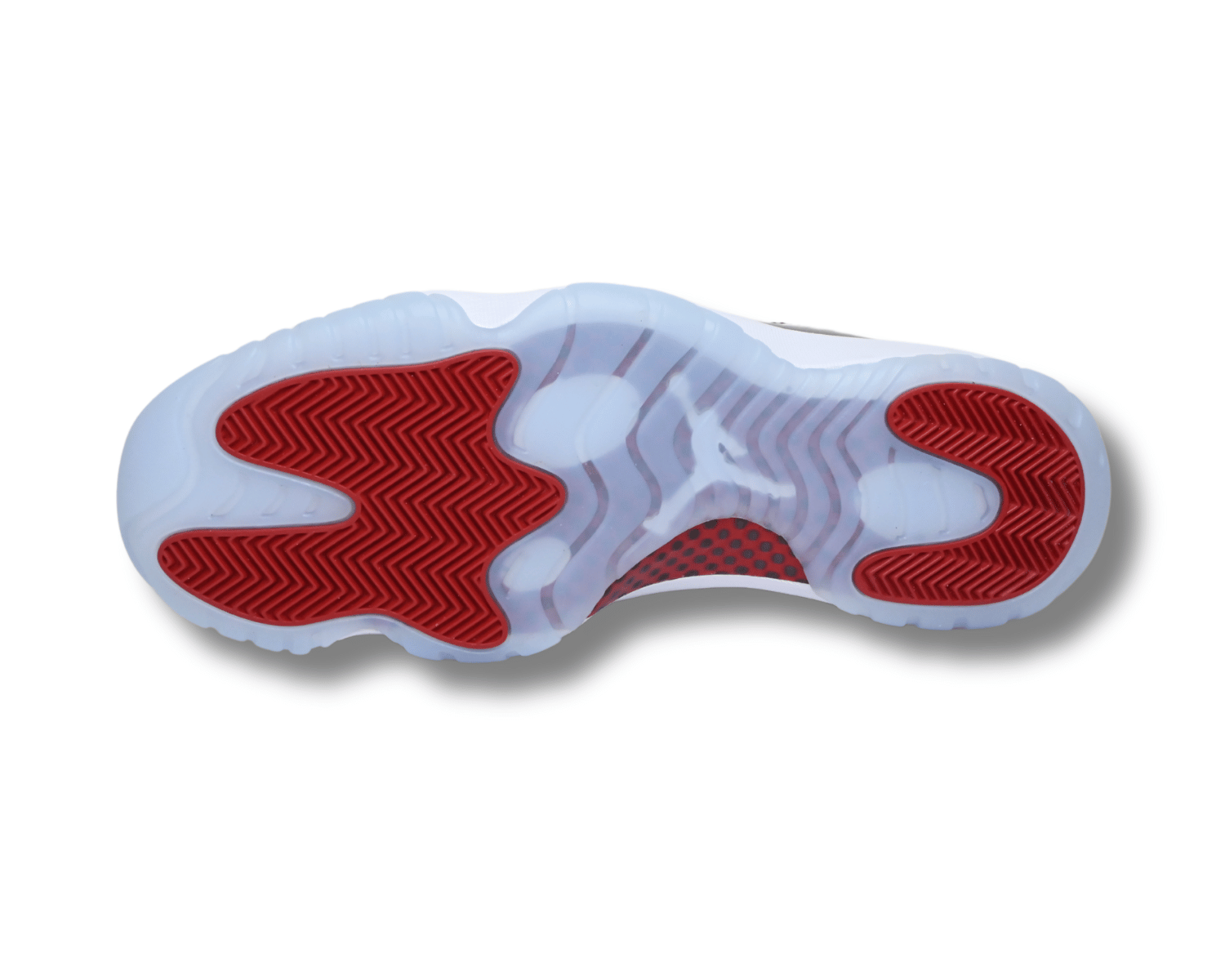 The Air Jordan 11 Retro ‘Cherry’ features a classic two-tone color scheme reminiscent of the 2001 low-top AJ11 ‘Varsity Red’. Its upper is constructed from white ballistic mesh with tonal webbing eyelets and a striking scarlet patent leather mudguard. Red accents are found on the inner collar and the embroidered Jumpman on the white leather heel overlay. The shoe offers lightweight comfort with a plush Phylon midsole, reinforced by a carbon fiber spring plate and a translucent rubber outsole.