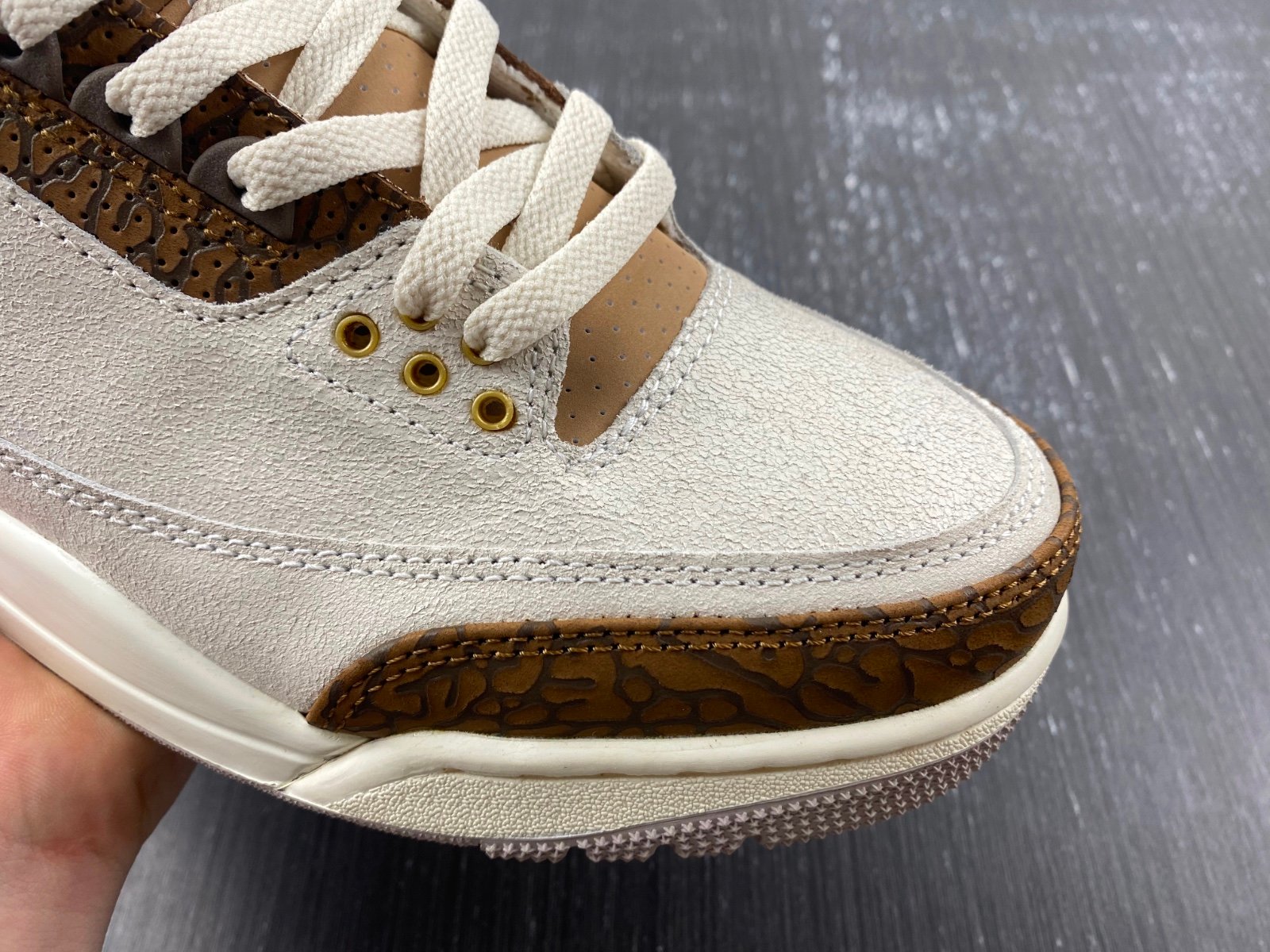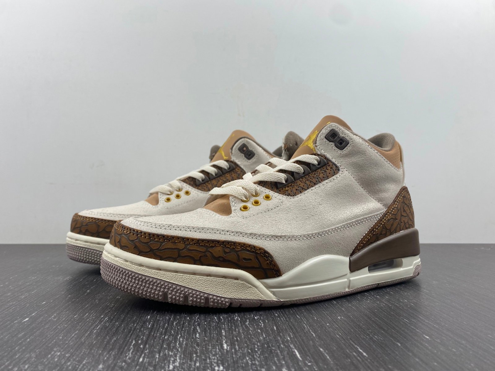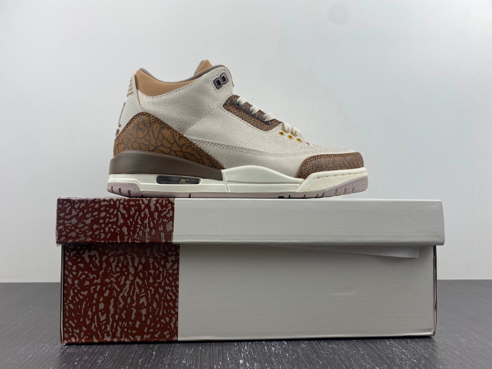 The Air Jordan 3 Retro Palomino reimagines the iconic silhouette with a rustic, earthy aesthetic. This modern interpretation features an off-white suede upper, complemented by rich brown elephant-print overlays on the forefoot and heel for a textured, heritage-inspired look. The design continues on the eyestay, while tan perforated nubuck adds subtle contrast and comfort to the padded collar.