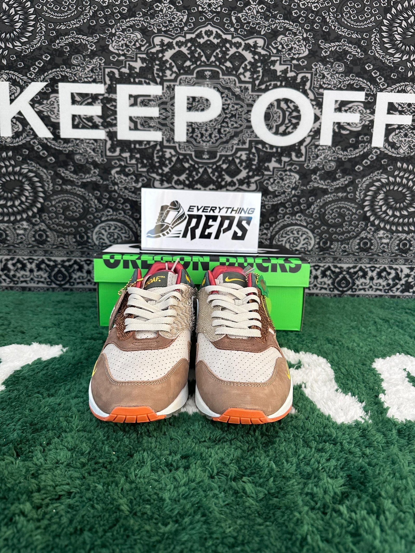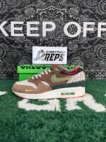 The Nike Air Max 1 ’87 Luxe University of Oregon PE showcases a striking design inspired by the Oregon Duck mascot. Featuring a mismatched upper with iridescent brown textiles at the toebox and green accents at the collar, these sneakers capture the vibrant spirit of the Pacific Northwest. Perforated tan leather overlays and beige suede on the mudguard add a luxurious texture, while white and gray leopard print eyestays and a mottled brown suede heel counter elevate the aesthetic. A bold blue Swoosh graces the side, complemented by a miniature Swoosh embroidered on the lateral toecap for a signature Nike touch.