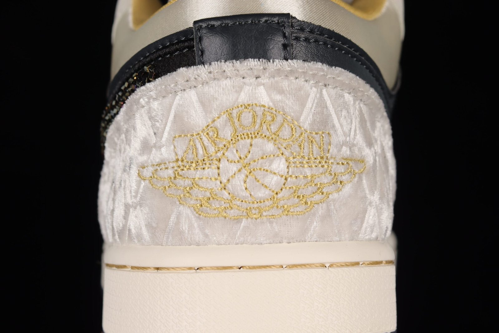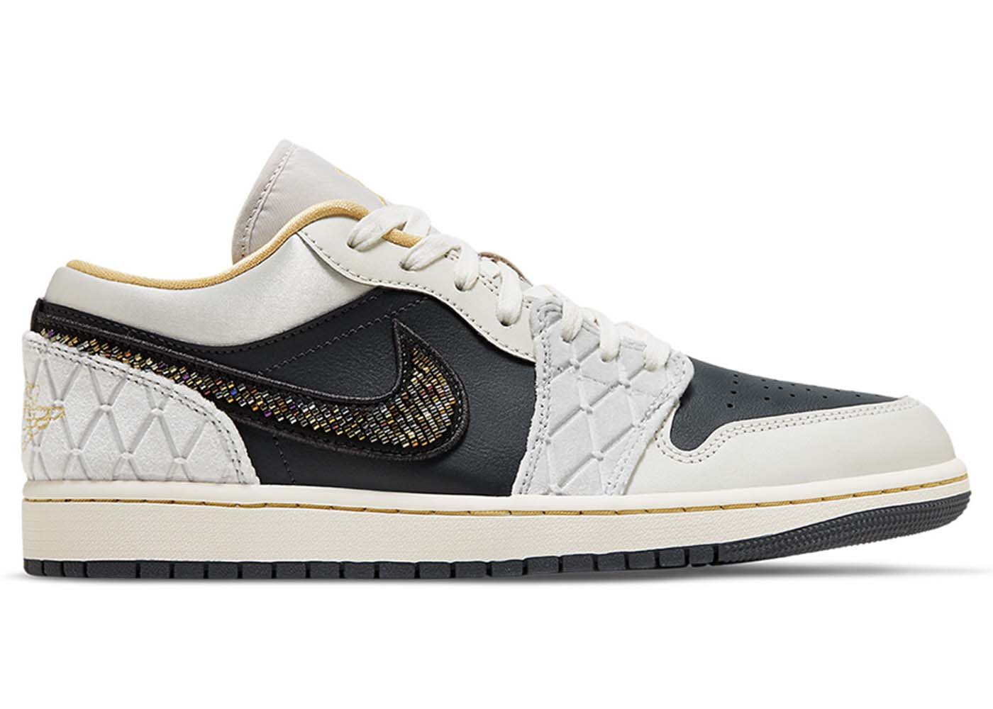 The Air Jordan 1 Low Beaded Swoosh is a premium lifestyle variation of the silhouette that has become common since the Jordan line’s debut in 2022. The Air Jordan 1 Low Beaded Swoosh features paneling made of leather, satin, and suede with diamond patterns. This sneaker is available in a black and gray color pattern with subtle undertones of gold for a luxurious touch. The low-top is further distinguished by an iridescent beaded Swoosh, and a sail midsole completes the design, with gold stitching and a black rubber outsole.