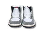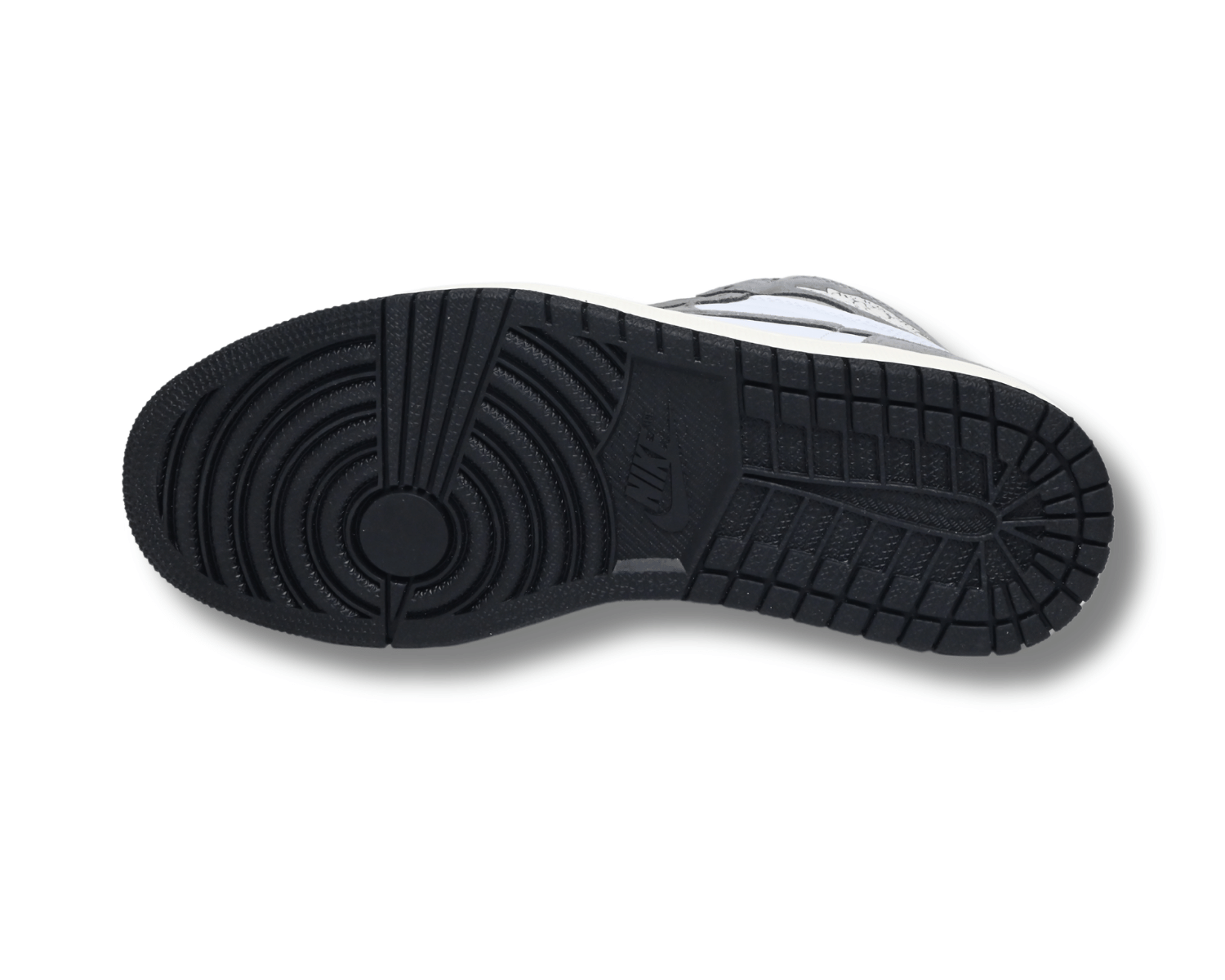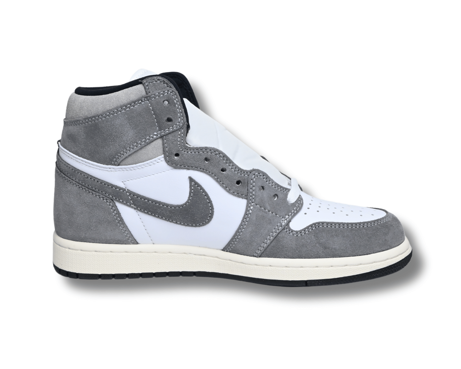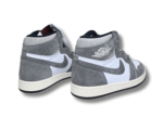 The Air Jordan 1 Retro High OG ‘Washed Black’ updates the classic silhouette with a refreshed build in neutral tones. The high-top features a white leather upper with grey suede overlays and a color-matched Swoosh. A lighter grey suede is used on the high-cut collar, which includes an ankle flap adorned with the iconic Wings logo. The breathable nylon tongue sports a woven Nike tag in black and red, adding a solitary pop of color to the design. The sneaker sits atop a vintage off-white midsole, complemented by a grippy black rubber outsole for traction.