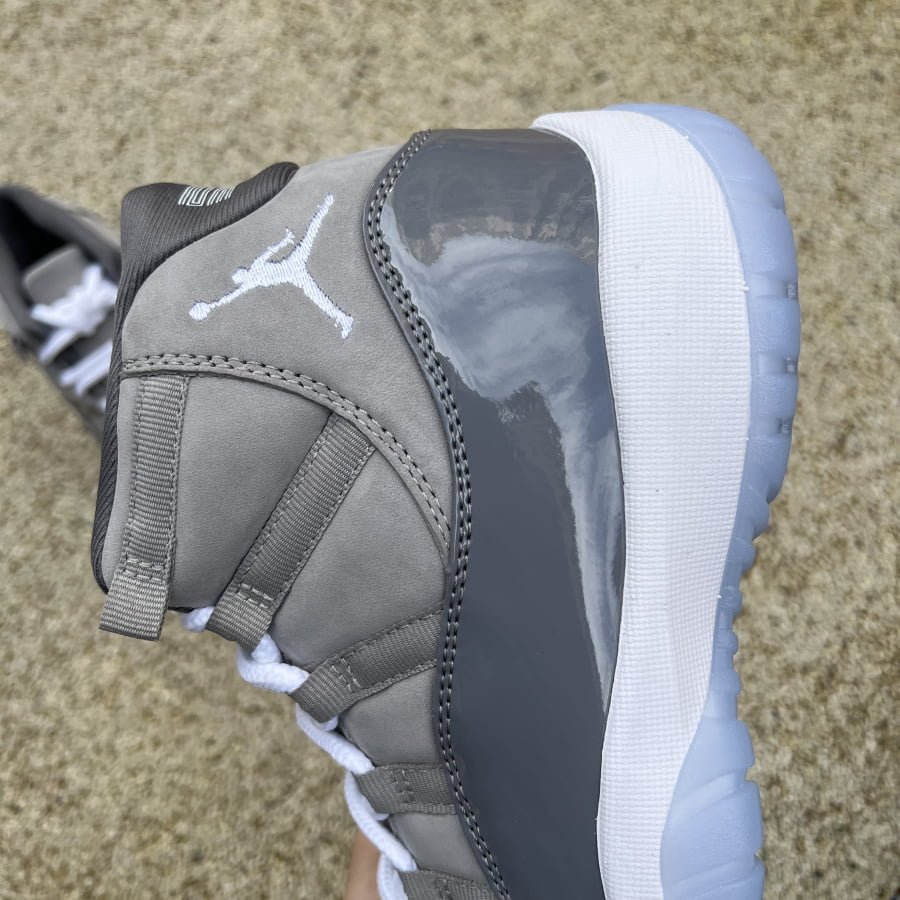 The 2010 reissue of the Air Jordan 11 Retro ‘Cool Grey’ brings back a beloved colorway first seen in 2001. This version features a sleek monochromatic grey upper made from nubuck with a shiny patent leather overlay. The shoe boasts a full-length Air unit within a lightweight Phylon midsole for enhanced cushioning. The translucent rubber outsole reveals a carbon fiber shank plate and includes herringbone traction pods on the forefoot and heel for superior grip.