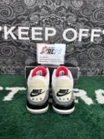 The Air Jordan 3 Retro White Cement Reimagined honors the original colorway, commemorating the AJ3’s 35th anniversary. Crafted to Tinker Hatfield’s 1988 specs, it features a white leather upper with iconic elephant print overlays. Air Jordan 3 Retro White Cement Reimagined varsity Red accents adorn the lace loops and Jumpman logo on the tongue. Nike Air branding graces the back heel tab, while a visible Air unit offers lightweight cushioning. A subtle touch of yellowing on the back heel and midsole adds a vintage vibe.