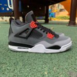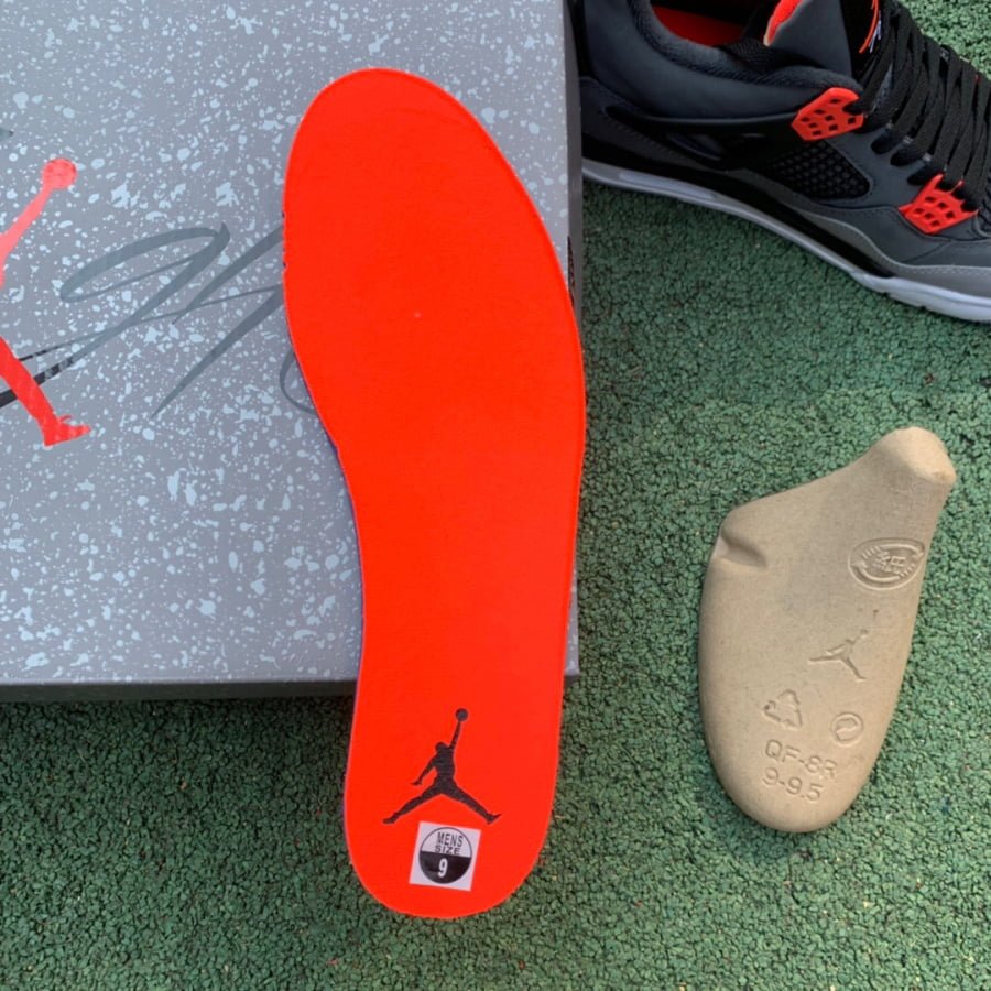 The Air Jordan 4 Retro ‘Infrared’ showcases distinctive color blocking reminiscent of the 2013 ‘Green Glow’ AJ4. The upper is made from smooth charcoal nubuck, with lighter grey on the forefoot overlay. Black accents highlight the quarter panel netting, structural wings, and Jumpman-branded heel tab. Infrared details appear on the woven tongue tag and molded eyelets. A polyurethane midsole with visible Air-sole cushioning in the heel ensures a comfortable ride.