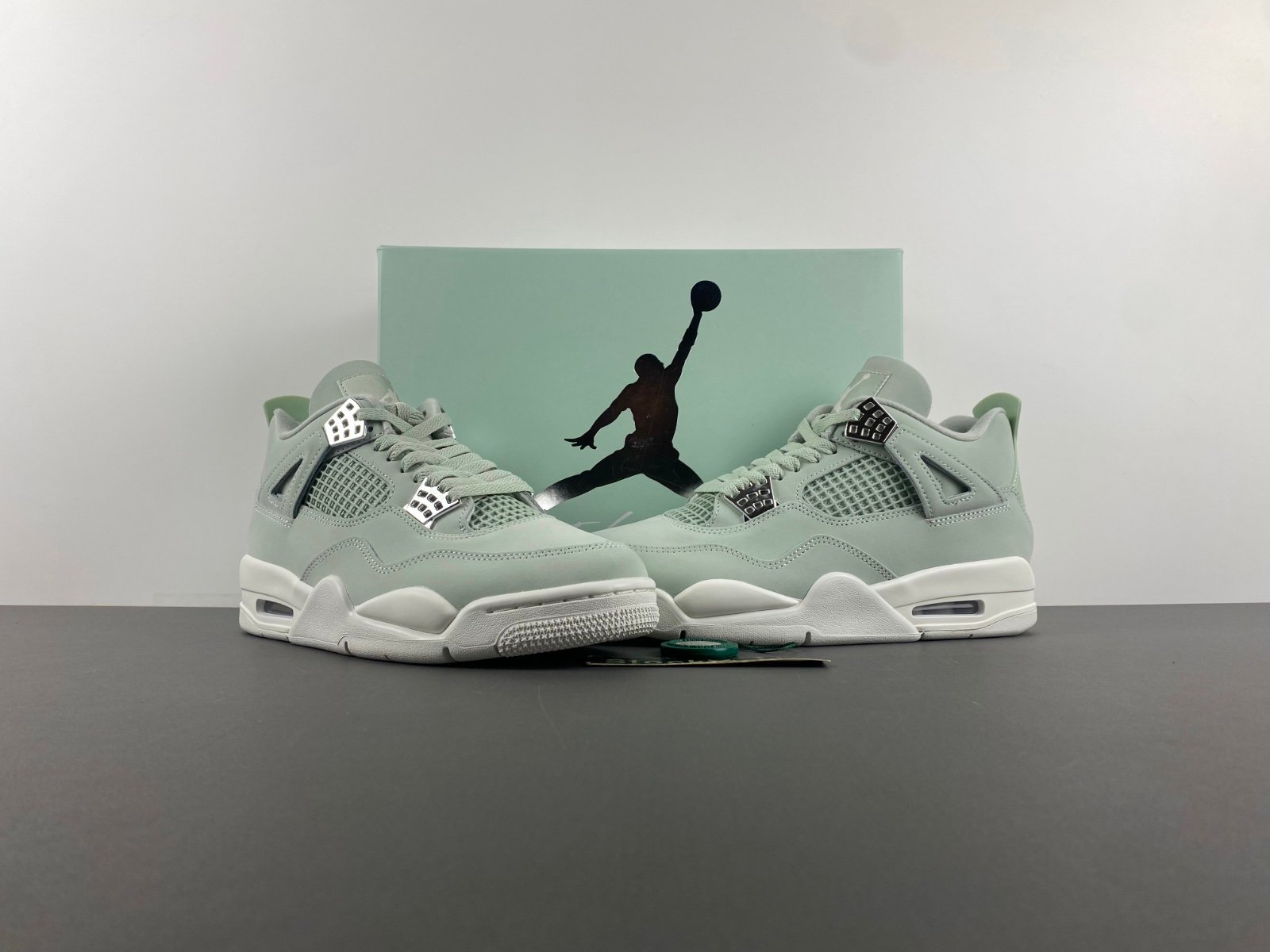 The Replica UA Air Jordan 4 Retro Seafoam Sail brings the iconic Air Jordan 4 silhouette into a fresh, vibrant colorway. This sneaker features a clean white leather upper accented with soothing seafoam green on the eyelets, mudguard, sock lining, and logos for a pop of color that captures the essence of the ocean. Designed with comfort in mind, it includes a breathable mesh underlay, a padded collar for support, and the signature visible Air-Sole unit in the heel for excellent cushioning. The durable rubber outsole ensures great traction and longevity, making this a stylish yet functional choice for sneaker enthusiasts looking to add a unique piece to their collection. This pair combines heritage style with modern functionality, offering an affordable way to enjoy the Air Jordan 4 aesthetic.