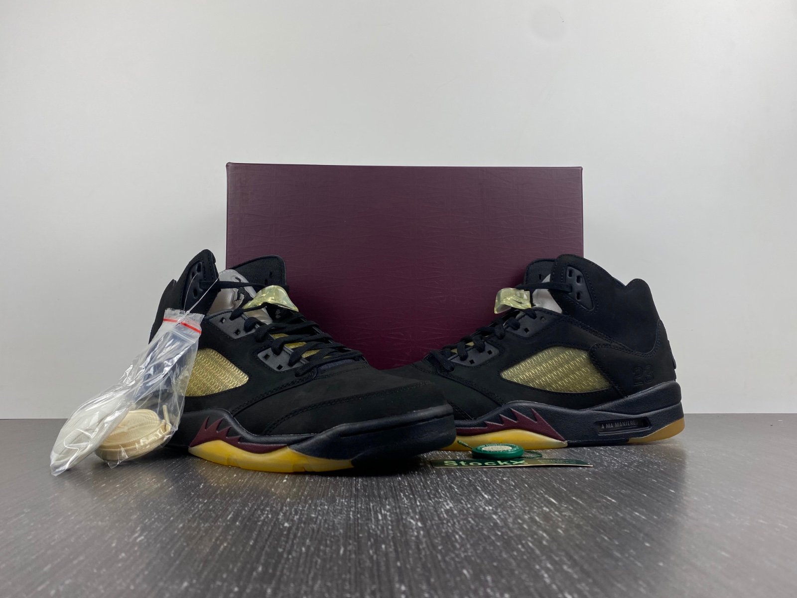 The A Ma Maniére x Air Jordan 5 Retro ‘Dusk’ reunites the creative partners on a two-sneaker collaborative pack. This pair carries a black nubuck upper, updated with a slimmed-down collar and pre-yellowed quarter panel netting formed with an interlocking series of A Ma Maniére’s signature ‘A’ logo. ‘Nike Air’ branding is embroidered on the back heel in tonal fashion, while silver reflective tongues display mismatched Jumpman and A Ma Maniére branding. The sneaker sits atop a matching black polyurethane midsole with shark-tooth detailing in a dark burgundy hue. A pre-aged translucent rubber outsole featuring the Atlanta-based retailer’s logo provides durable traction underfoot.