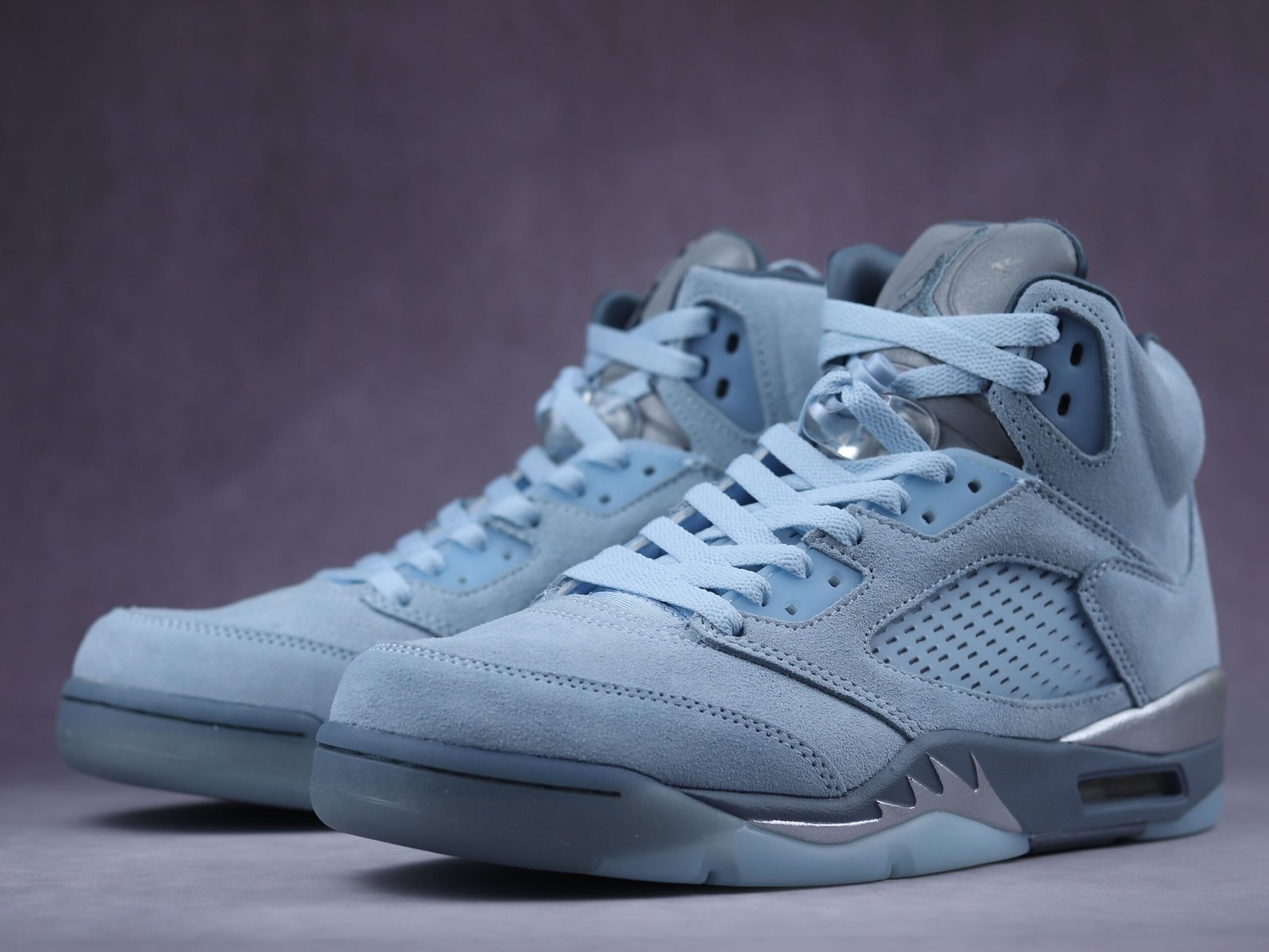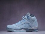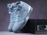 The women’s Air Jordan 5 Retro ‘Blue Bird’ offers a vibrant makeover of the classic silhouette. This model features a bright blue suede upper, maintaining the standard AJ5 design elements such as lace locks, molded TPU eyelets, and clear netting on the quarter panels. The shoe’s aesthetic is highlighted by a blue Jumpman logo embroidered on a silver reflective tongue, which complements the silver shark tooth detailing on the polyurethane midsole. The design is finished with an icy blue rubber outsole that includes a herringbone traction pattern for superior grip.
