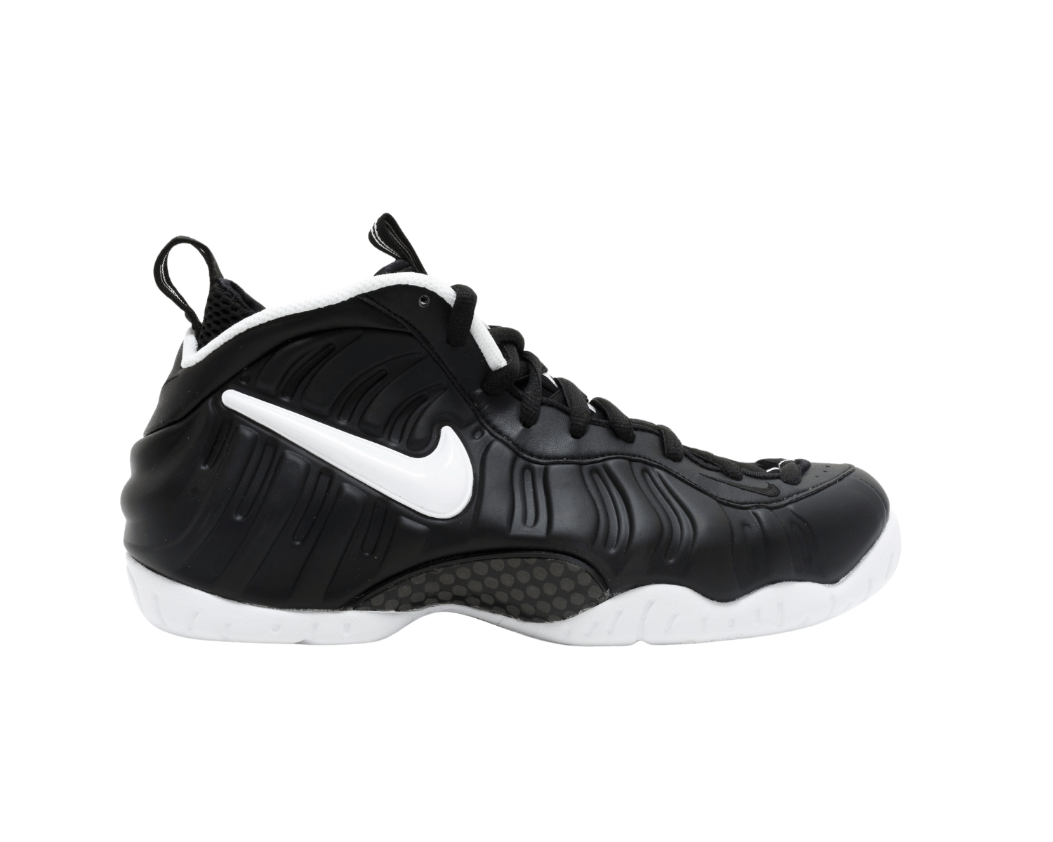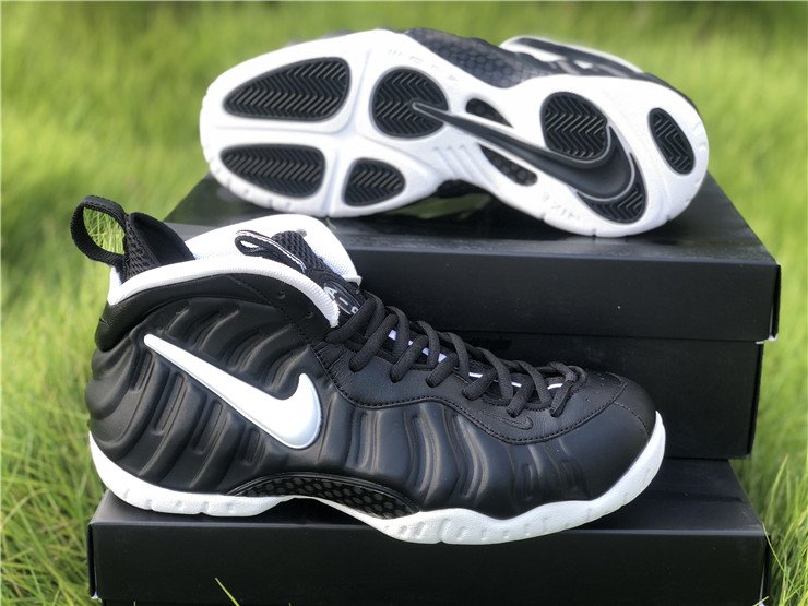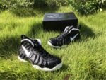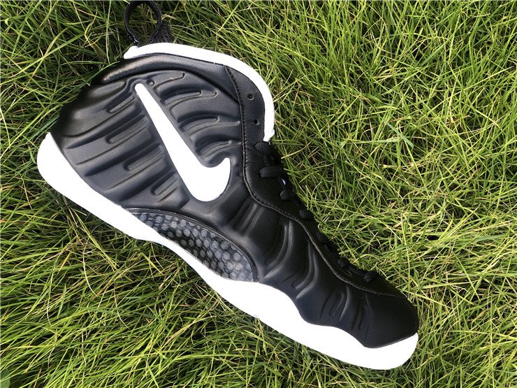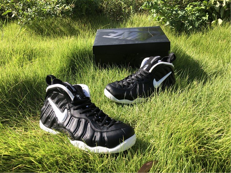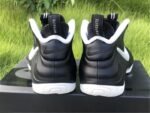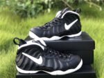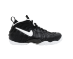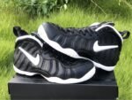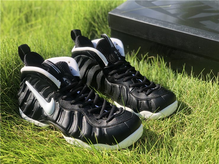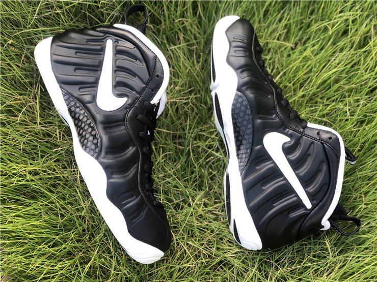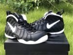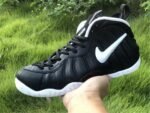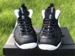 The upper features the signature Foamposite shell, offering lightweight durability and a custom fit that molds to the shape of the foot over time. A white Swoosh on the side panel provides a sharp visual pop against the matte black upper, while thick black laces, a padded collar and tongue, and heel/tongue pull tabs ensure comfort and ease of wear.