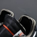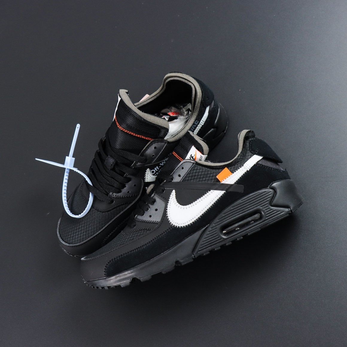 The Off-White x Air Max 90 ‘Black’ showcases a distinct mix of materials, featuring a ripstop fabric base paired with nubuck overlays and a suede mudguard. The sleek black design is highlighted by a white Swoosh, accented with zigzag stitching, while an orange tab and stitching on the exposed-foam tongue add a pop of color. Virgil Abloh’s signature touch is evident in the text block that appears on the medial side of the shoe.