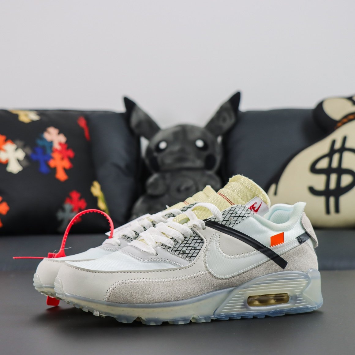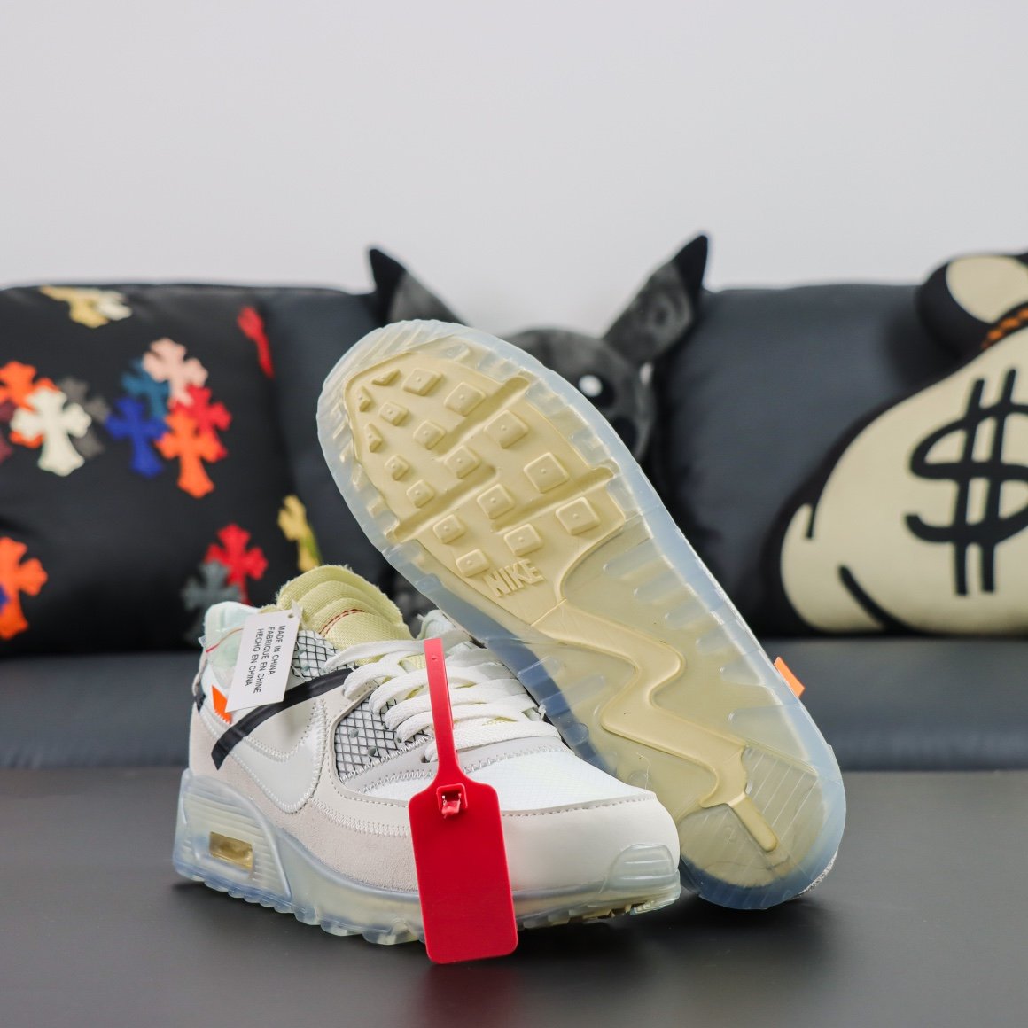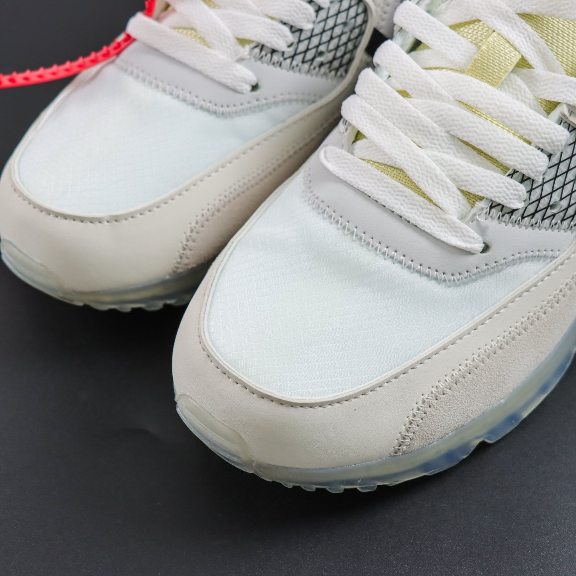 The Nike Air Max 90 Off White sneaker showcases a complex design with various panels covering the upper. Mesh serves as the base layer across the mudguards, profile panels, tongue, and heel.