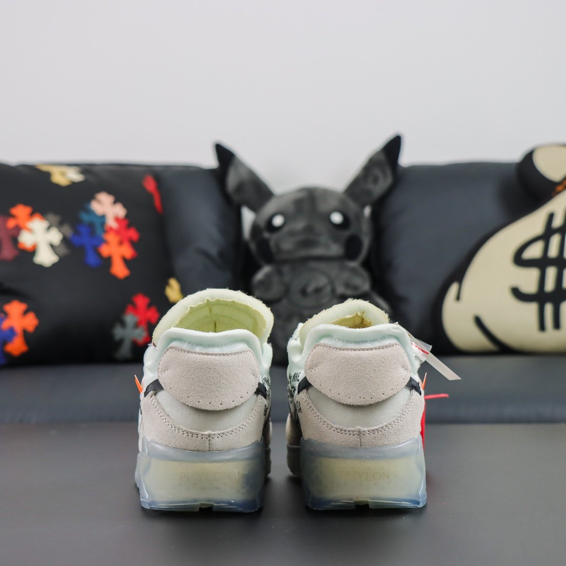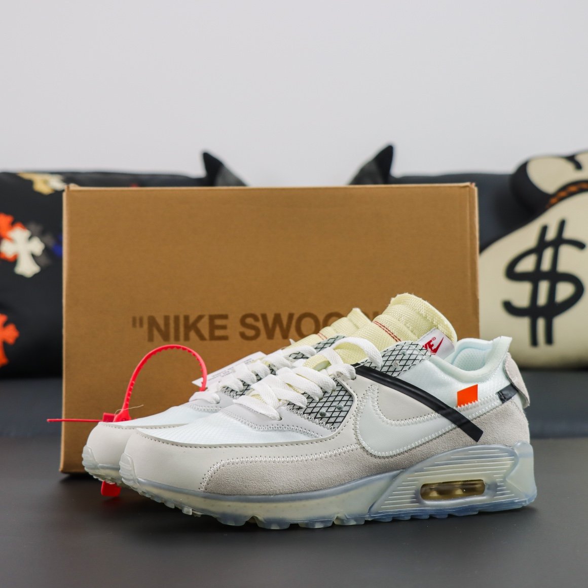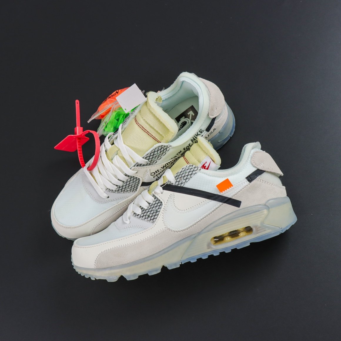The Nike Air Max 90 Off White sneaker showcases a complex design with various panels covering the upper. Mesh serves as the base layer across the mudguards, profile panels, tongue, and heel.