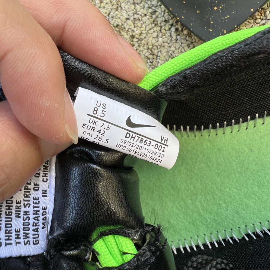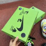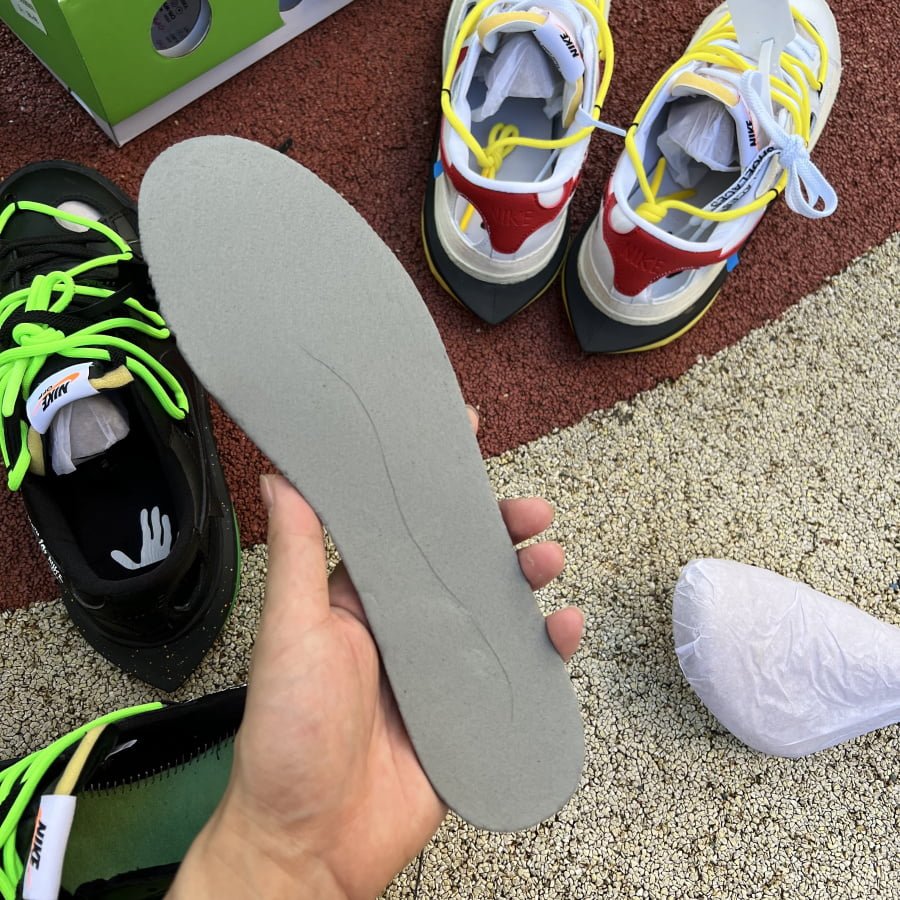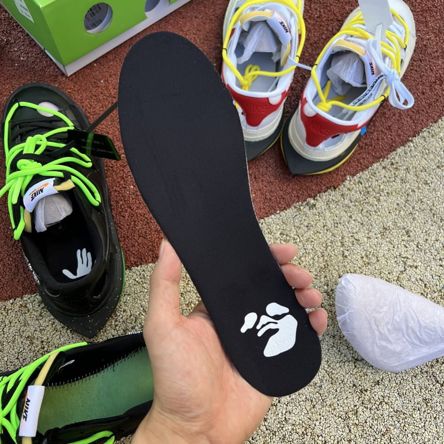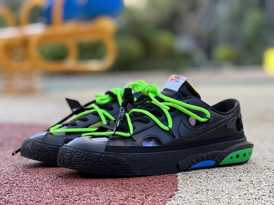 The Nike Blazer Low 77 Off-White Electro Green blends Virgil Abloh’s multi-sport influence with Off-White’s signature deconstructed aesthetic. The black leather upper features punched-out holes, reminiscent of the Air Jordan 5 Off-White, while the Electro Green over-lacing system adds a striking pop of color. The fusion of a TPU heel piece from the Air Terra Humara and a classic vulcanized sole creates a unique foundation. Completing the look are signature Off-White details like the exposed foam tongue, zip tie tag, and Swoosh tab.