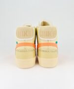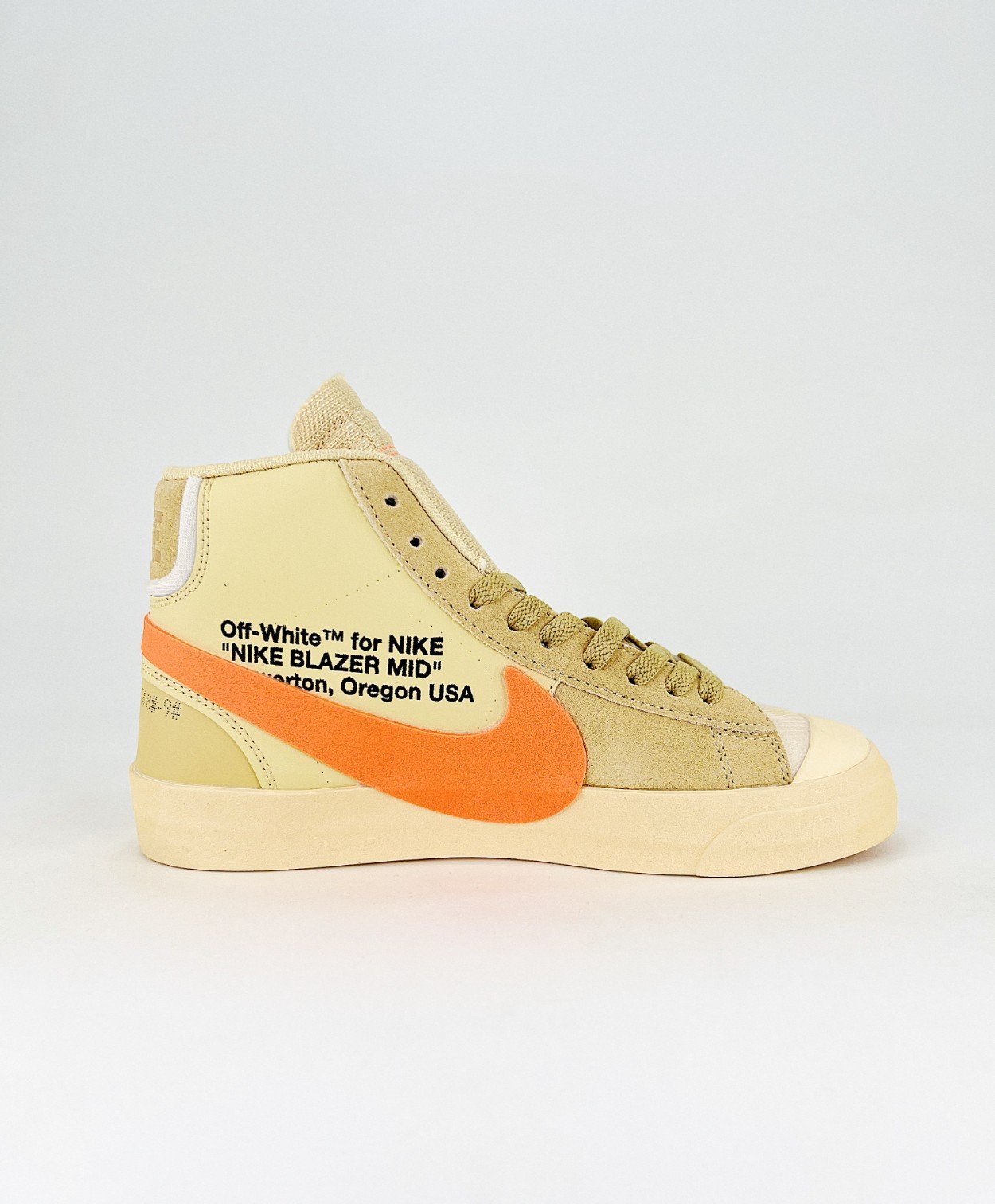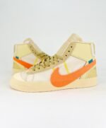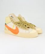 Nike Blazer Mid Off-White All Hallow’s Eve features a vibrant orange Swoosh against a Pale Vanilla base. The yellowish tan tone extends across the foam tongue and rubber midsole, while a blue zip tie adds a striking contrast. Virgil Abloh’s signature text is printed on the medial side, completing the unique design.