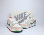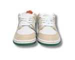 Nike SB Dunk Low Jarritos brings together vibrant design elements inspired by the beloved Mexican soda brand. The sneaker features a Phantom white leather base with hemp canvas overlays, complemented by a Malachite green textile Swoosh. The Jarritos logo is embroidered in green and orange on the lateral heel, while the woven tongue tag displays dual branding. Unique details include mismatched heel tabs, with ‘Nike’ and ‘Jarritos’ embroidered on each shoe. A white rubber cupsole with a two-tone green and orange outsole rounds out the bold, playful look.