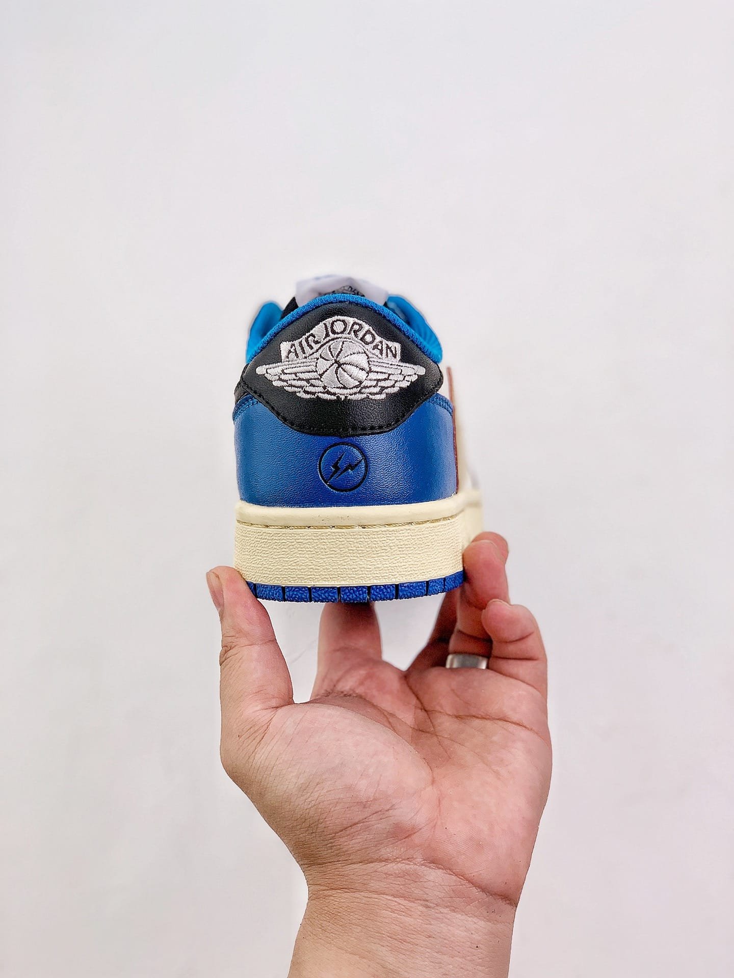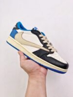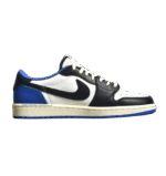 The Air Jordan 1 Low Fragment Design x Travis Scott is a collaboration that fuses signature elements from both Travis Scott and Hiroshi Fujiwara’s renowned brand. The color scheme pays homage to previous Fragment collaborations, featuring a white leather upper with striking overlays in black and royal blue. Scott’s distinctive oversized Swoosh in an off-white hue embellishes the lateral side, while a standard black Swoosh graces the opposite side. Air Jordan 1 Low Fragment Design x Travis Scott’s “Cactus Jack” branding and the rapper’s iconic smiley face logo adorn the left shoe’s heel tab, while the right shoe showcases a combination of the classic “Jordan Wings” logo and Fragment’s “lightning bolt” trademark.