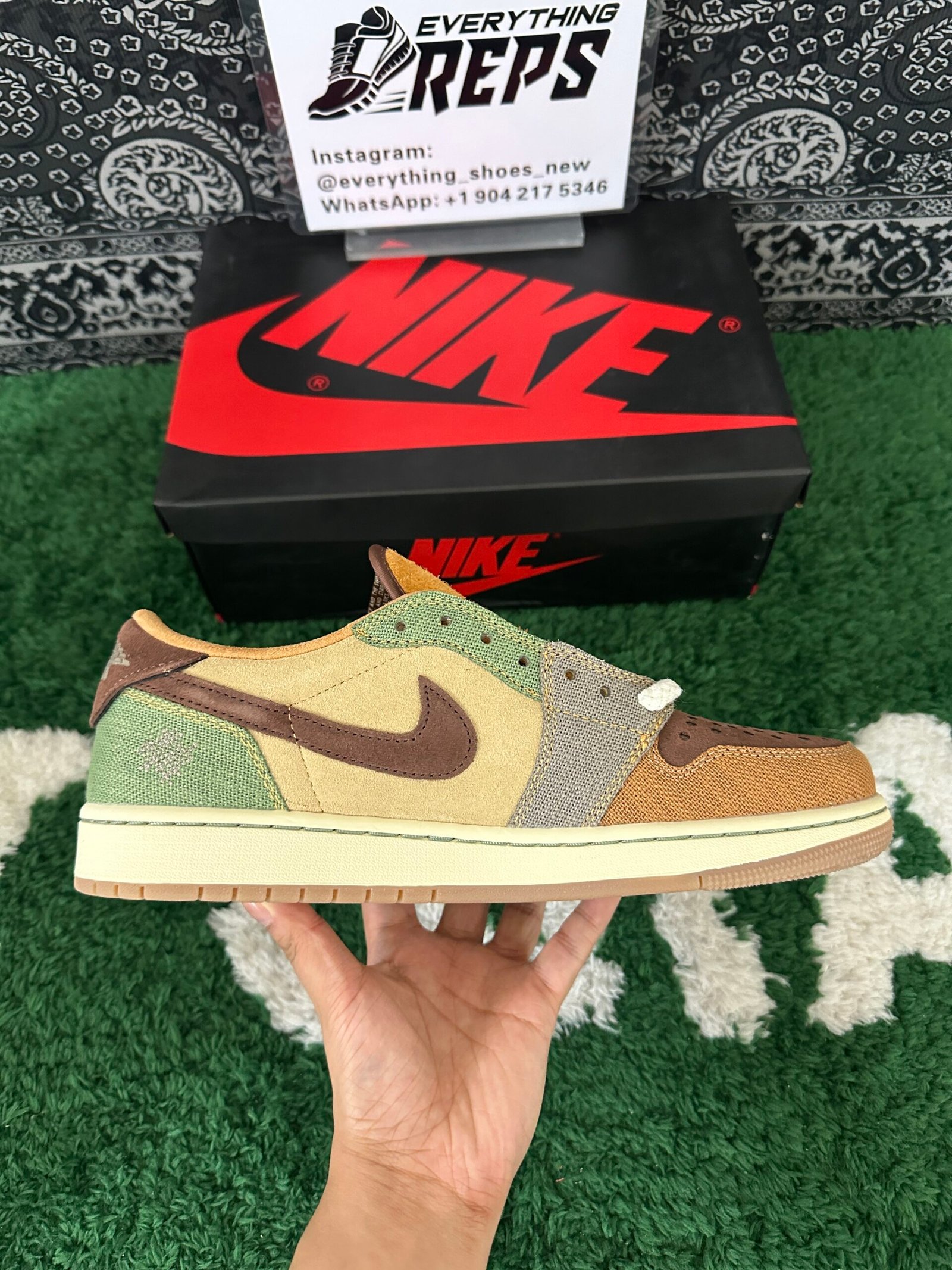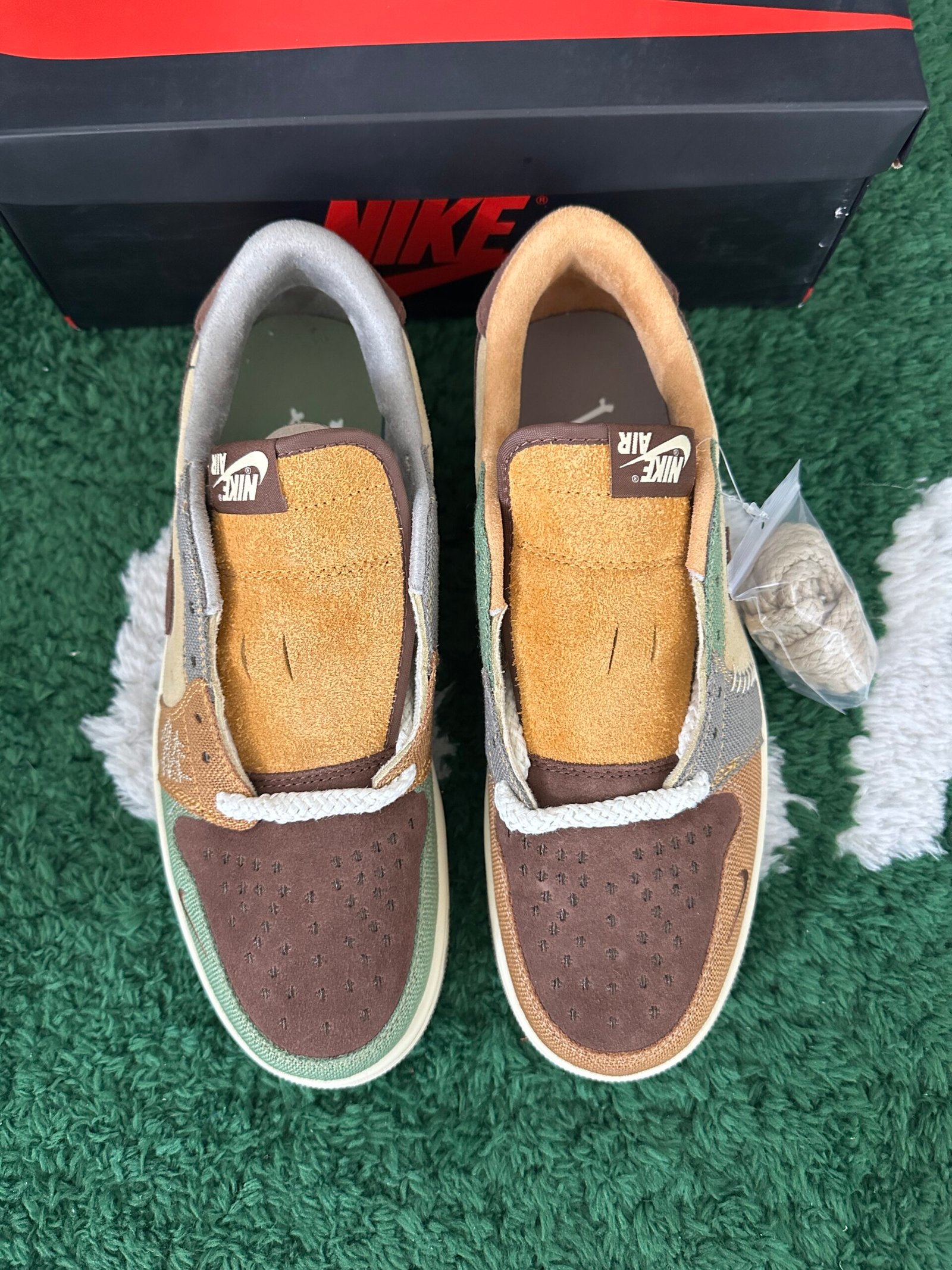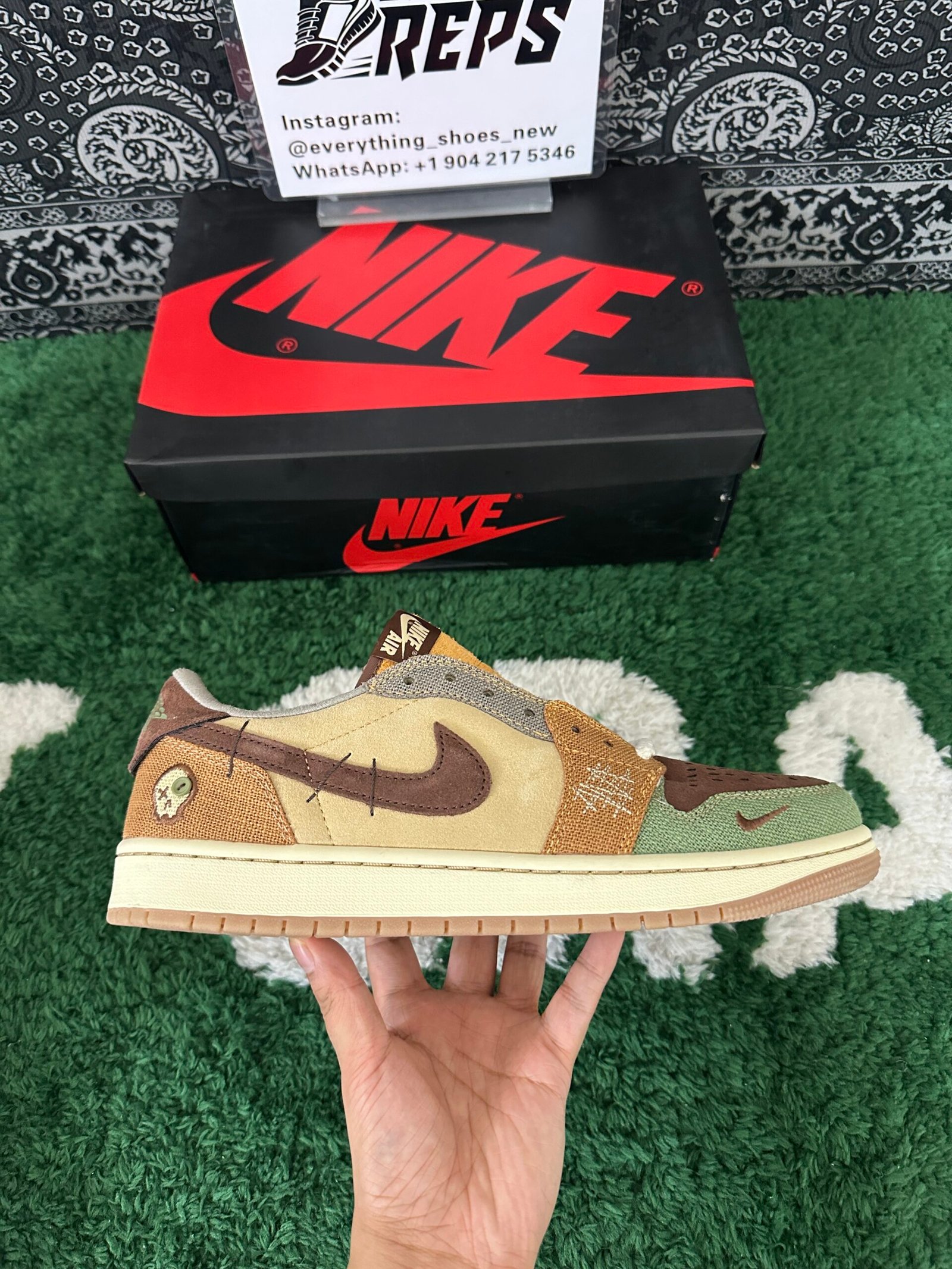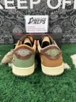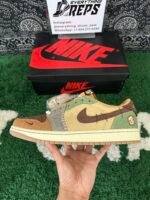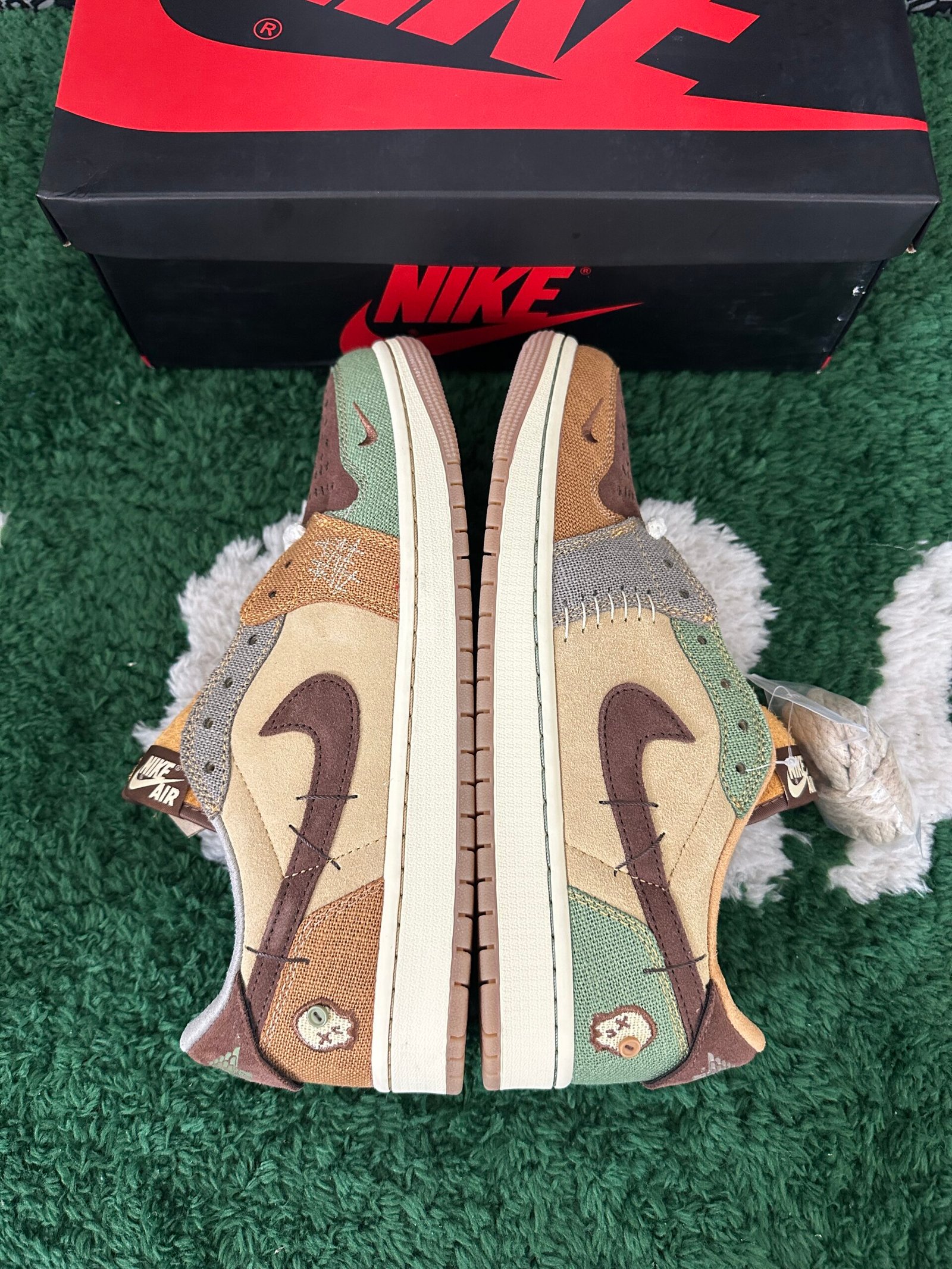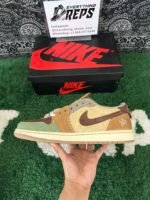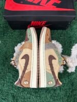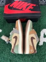 The Zion Williamson x Air Jordan 1 Retro Low OG ‘Voodoo’ features a New Orleans-inspired design, echoing the Zion 2 colorway from June 2022. The shoe’s upper includes beige suede quarter panels, a brown suede toe box, and burlap-like overlays with raw edges and mismatched colors in light brown, Oil Green, and Fossil. Unique details include braided rope laces, an inverted mini-Swoosh on the forefoot, and an embroidered voodoo-doll graphic on the lateral heel. The brown suede heel tab showcases an upside-down Wings logo and lifts to reveal ‘Voodoo’ and ‘Zion’ graphics.