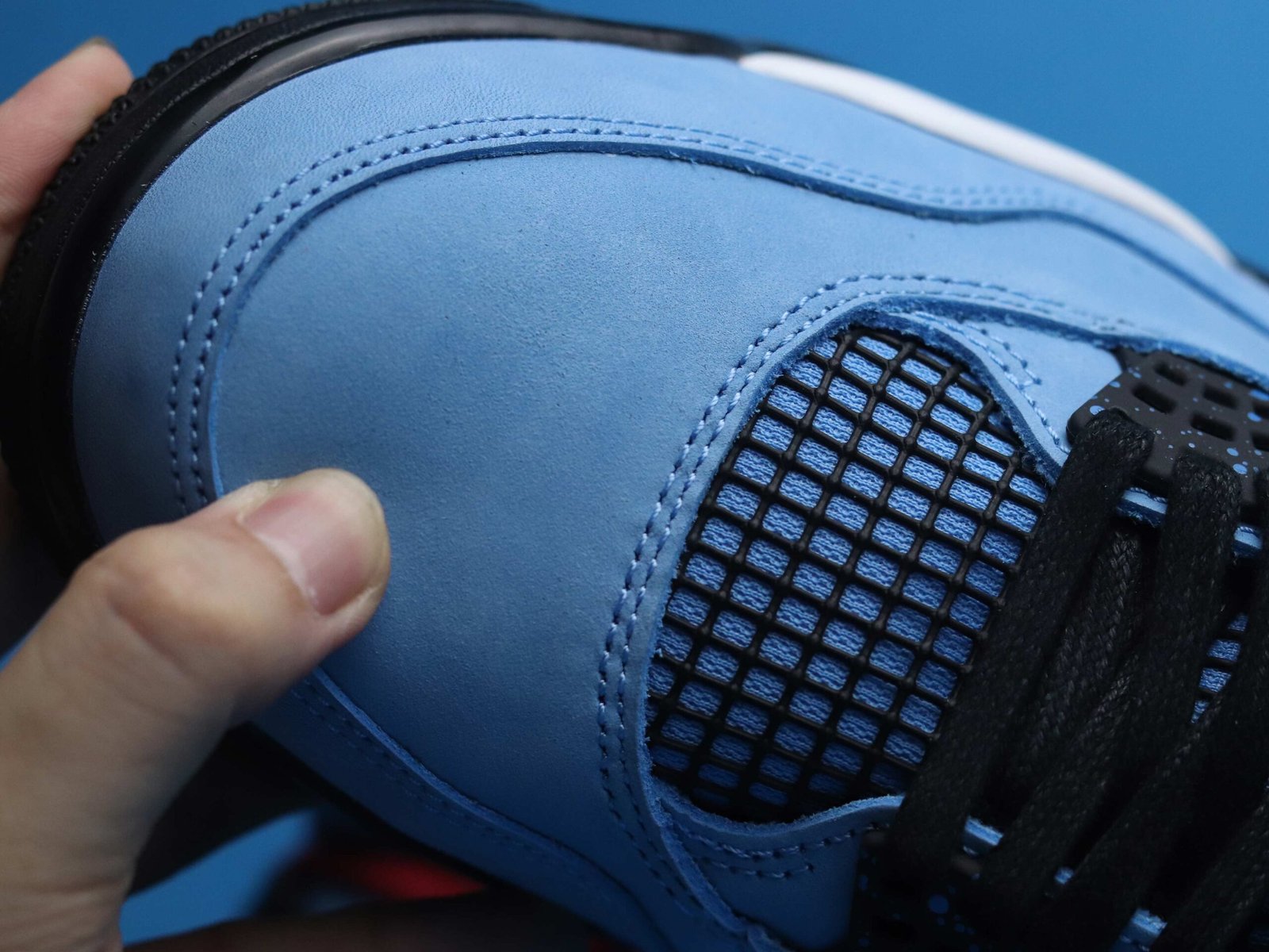 The Air Jordan 4 Retro Travis Scott Cactus Jack pays homage to Houston’s former football team, the Oilers, with a striking University Blue Durabuck leather upper. This colorway mirrors the team’s iconic red, white, and blue uniforms, featuring a Varsity Red insole and black lace cage. Air Jordan 4 Retro Travis Scott Cactus Jack has a light blue speckle pattern decorates both the lace cage and heel panel. Cactus Jack branding in Varsity Red adorns the left heel, while a matching Jumpman logo appears on the right, completing the tribute to Travis Scott’s hometown.