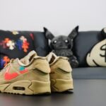The Nike Air Max 90 OFF-WHITE Desert Ore brings another imaginative twist from Virgil Abloh to the classic silhouette. Unlike the bold black and white versions, this design sports a mixed-material upper in a warm tan hue. A vibrant Bright Mango stitched Swoosh stands out, complemented by Abloh’s signature details like the blue zip tie and printed text on the medial side.