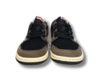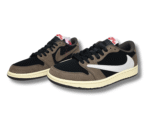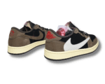 Travis Scott X Air Jordan 1 Low Mocha , Travis Scott teams up with Jordan Brand for an Air Jordan 1 Low, echoing the design of the high-top variant. The shoe showcases a large backward Swoosh on the lateral side and a standard Swoosh on the medial side. The upper is crafted from Black and Dark Mocha nubuck, accented with University Red highlights. Subtle Travis Scott branding includes the ‘Cactus Jack’ logo on the tongue, medial side panel, and sockliner. The heel tabs display detailed stitching, featuring the Air Jordan Wings on the right shoe and Scott’s hand-drawn face on the left shoe.
