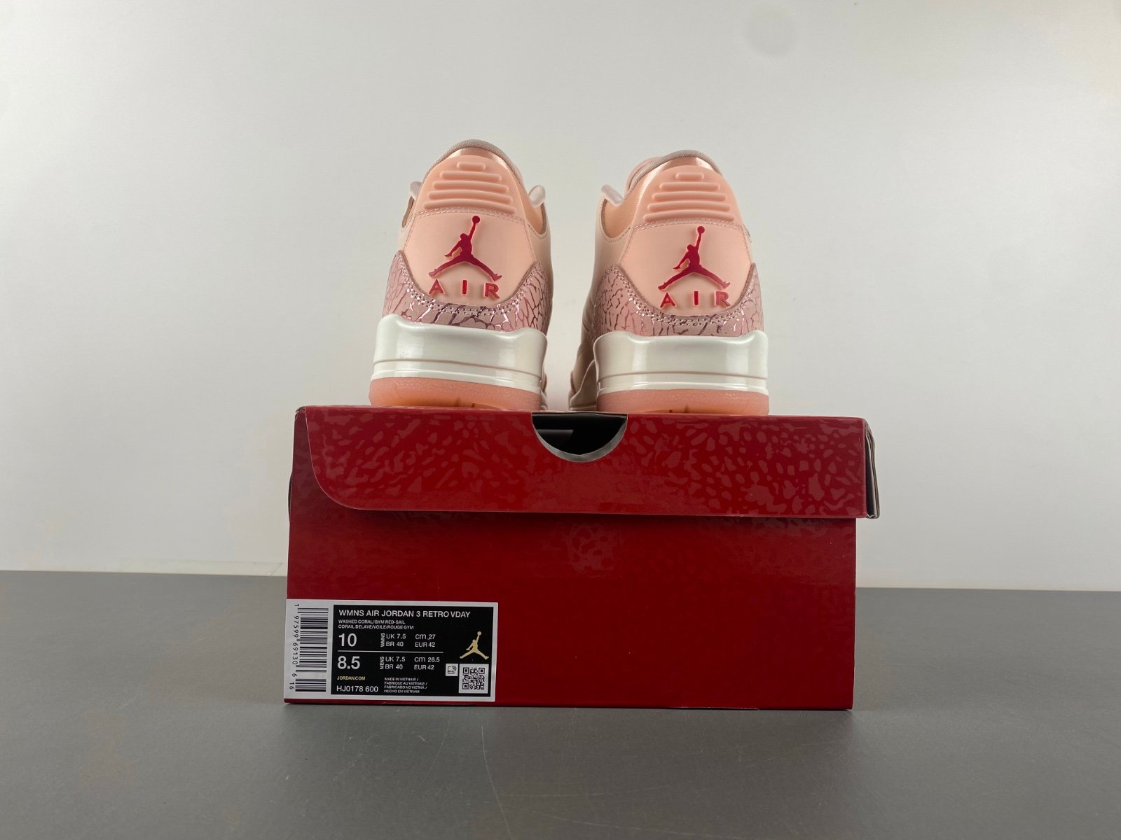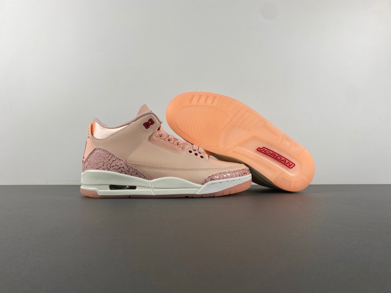 Celebrate love and elevate your sneaker game with the Replica UA Air Jordan 3 “Valentine’s Day” edition. Designed with women in mind, this romantic rendition features a charming blend of Washed Coral, Gym Red, and Sail tones. The upper is crafted from premium pink leather, accented with metallic elephant print overlays on the toe and heel for a refined touch of glam.
