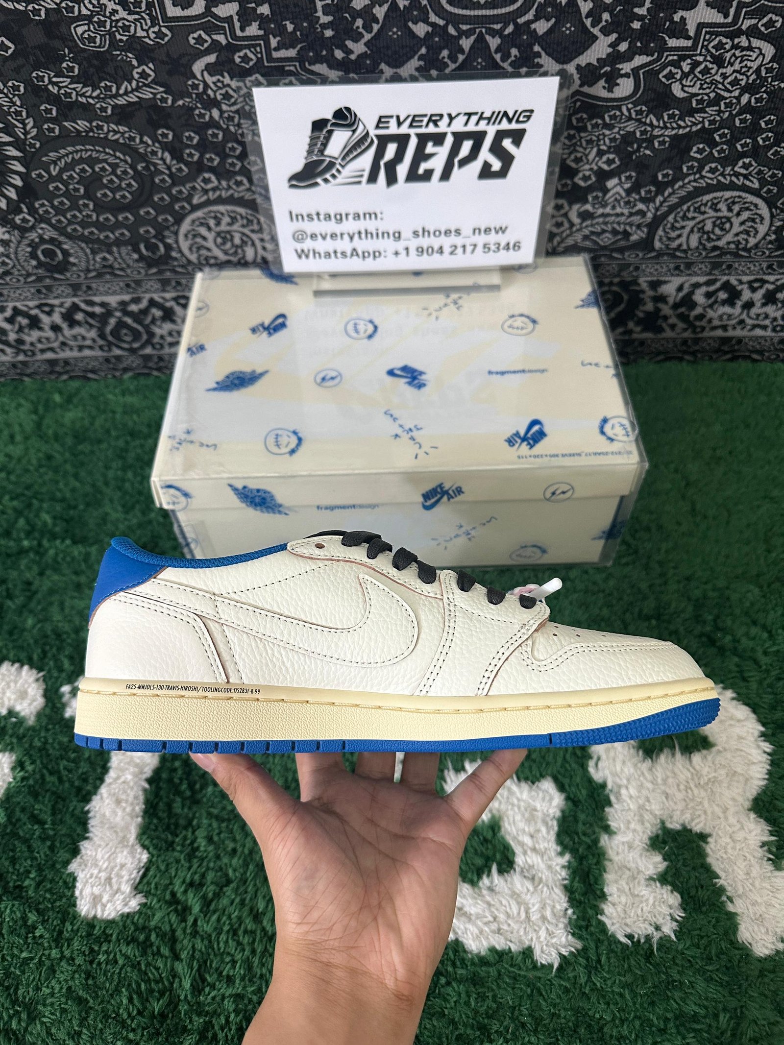 Signature co-branding brings the story full circle, with Cactus Jack and Fragment logos stamped on the heels, while discreet black text on the midsole adds an extra layer of detail. With its blend of design legacy, streetwear influence, and collector appeal, the White Blue Fragment stands as a must-have for sneaker enthusiasts and Travis Scott fans alike.